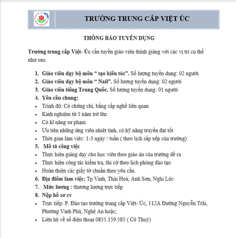 Căn cứ theo nhu cầu giảng dạy và mở rộng chất lượng đào tạo, Trường Trung Cấp Việt Úc thông báo tuyển dụng Giáo viên thỉnh giảng với các thông tin như trên.